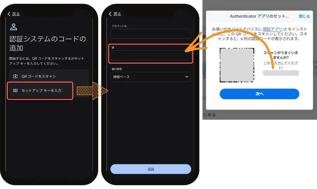 その場合は、アプリの「セットアップキーの入力」をタップして、「鍵」の欄に文字コードを入力します。