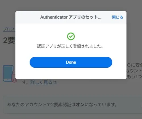 「認証アプリが正しく登録されました。」と表示されたら、完了です。